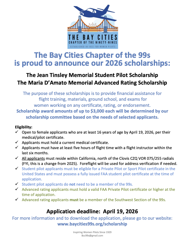 The Bay Cities Chapter of the Ninety-Nines is proud to have two scholarships:
